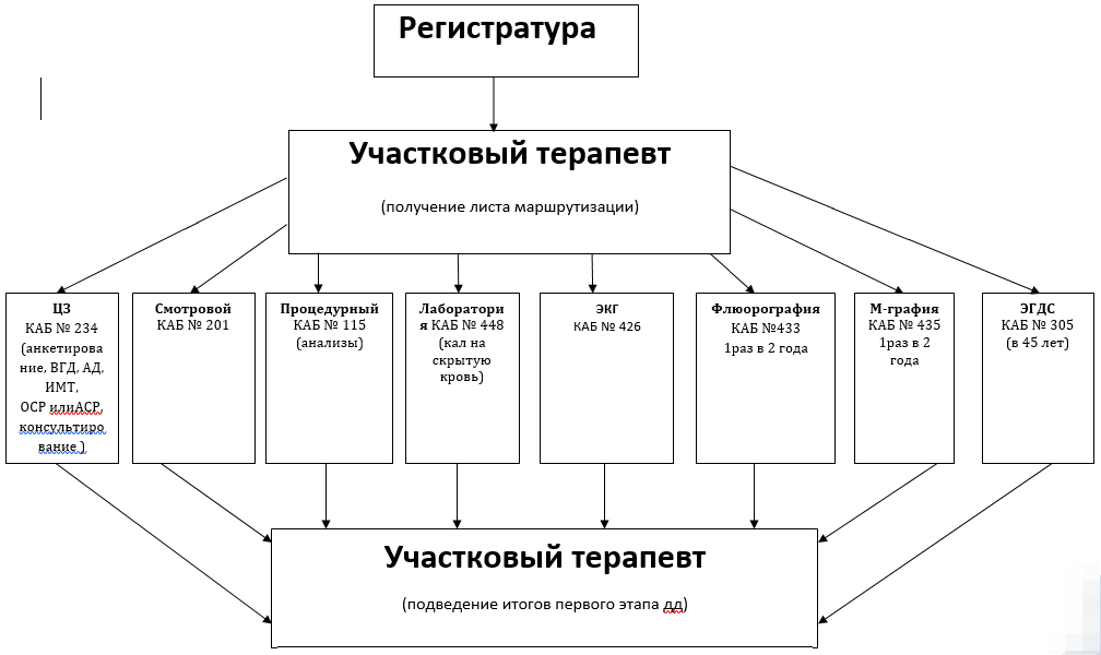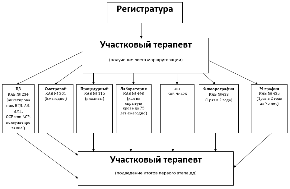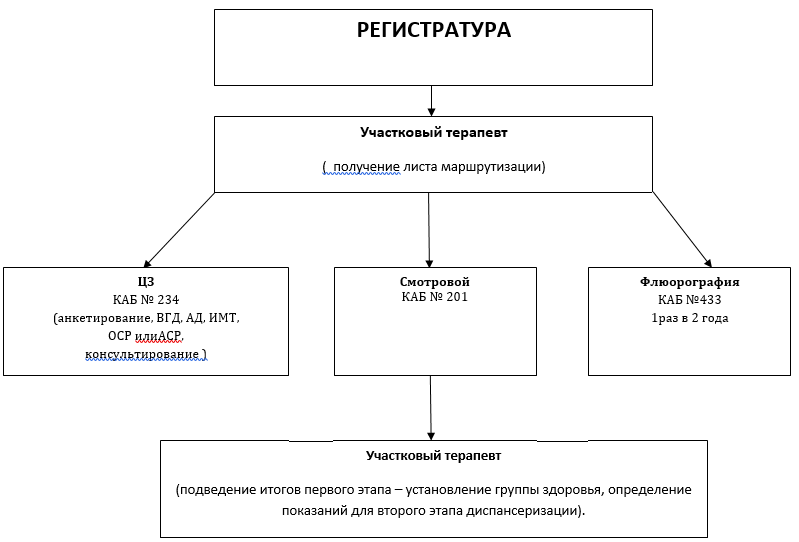 Первый этап диспансеризации (скрининг) проводится с целью выявления у граждан признаков хронических неинфекционных заболеваний, факторов риска их развития, риска пагубного употребления алкоголя, потребления наркотических средств и психотропных веществ без назначения врача, определения группы здоровья, а также определения медицинских показаний к выполнению дополнительных обследований и осмотров врачами-специалистами для уточнения диагноза заболевания (состояния) на втором этапе диспансеризации.